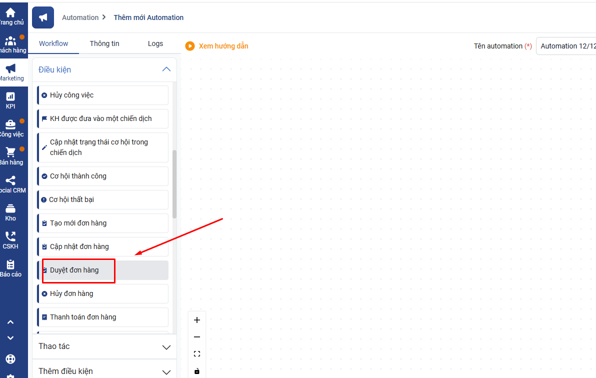 Kéo khối Duyệt đơn hàng sang màn hình cài đặt automation