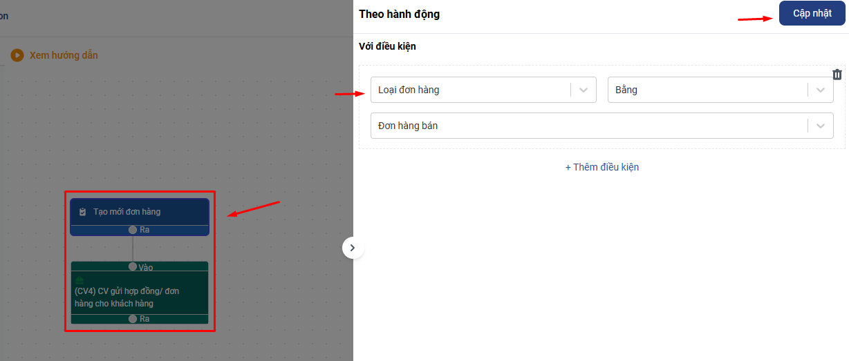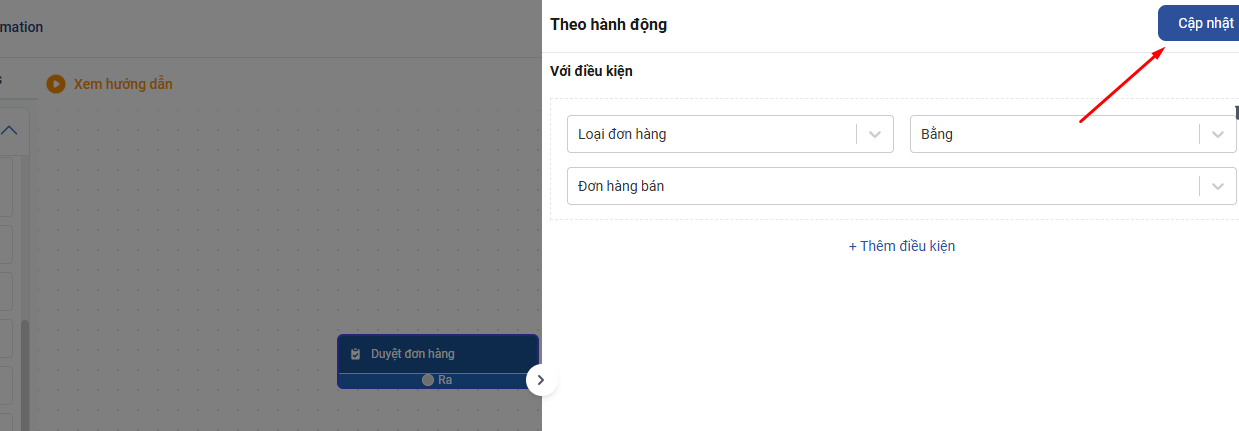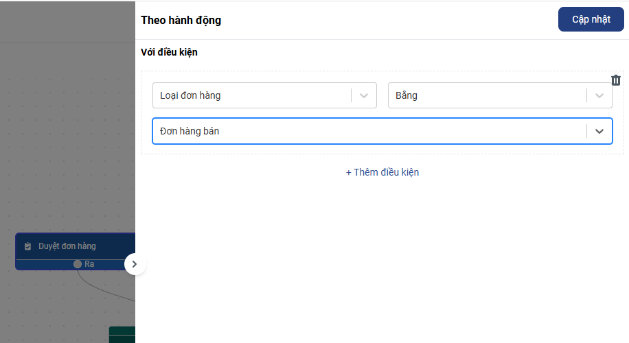 Click vào khối Duyệt đơn hàng vừa chọn , màn hình cài đặt hành động Duyệt đơn hàng sẻ hiện ra. Ở Khung Với điền kiện bạn chọn Loại đơn hàng/ Bằng/ Đơn hàng bán