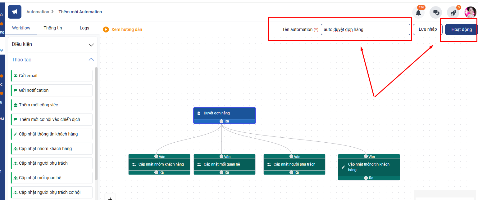 Lưu ý: Bạn có thể lựa chọn 1 hoặc 1 vài mục để tạo automation nhắc nhở nhân viên các đầu việc cần làm. Đối với các mục không quá quan trọng, bạncó thể linh hoạt lựa chọn thay đổi hệ quả là gửi thông báo thay vì tạo việc để tránh tình trạng nhân viên có quá nhiều công việc cần thao tác.
