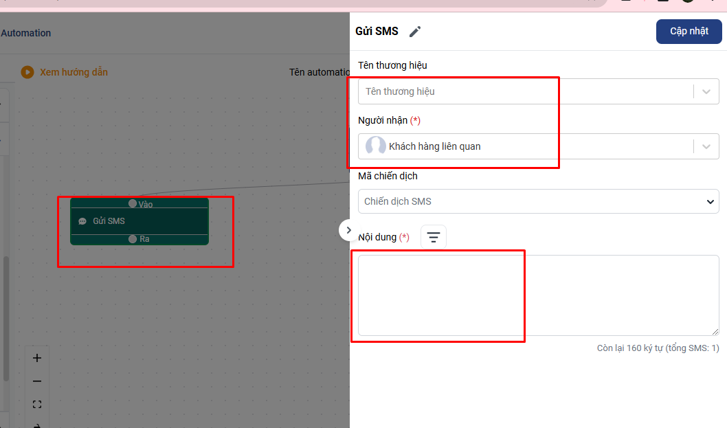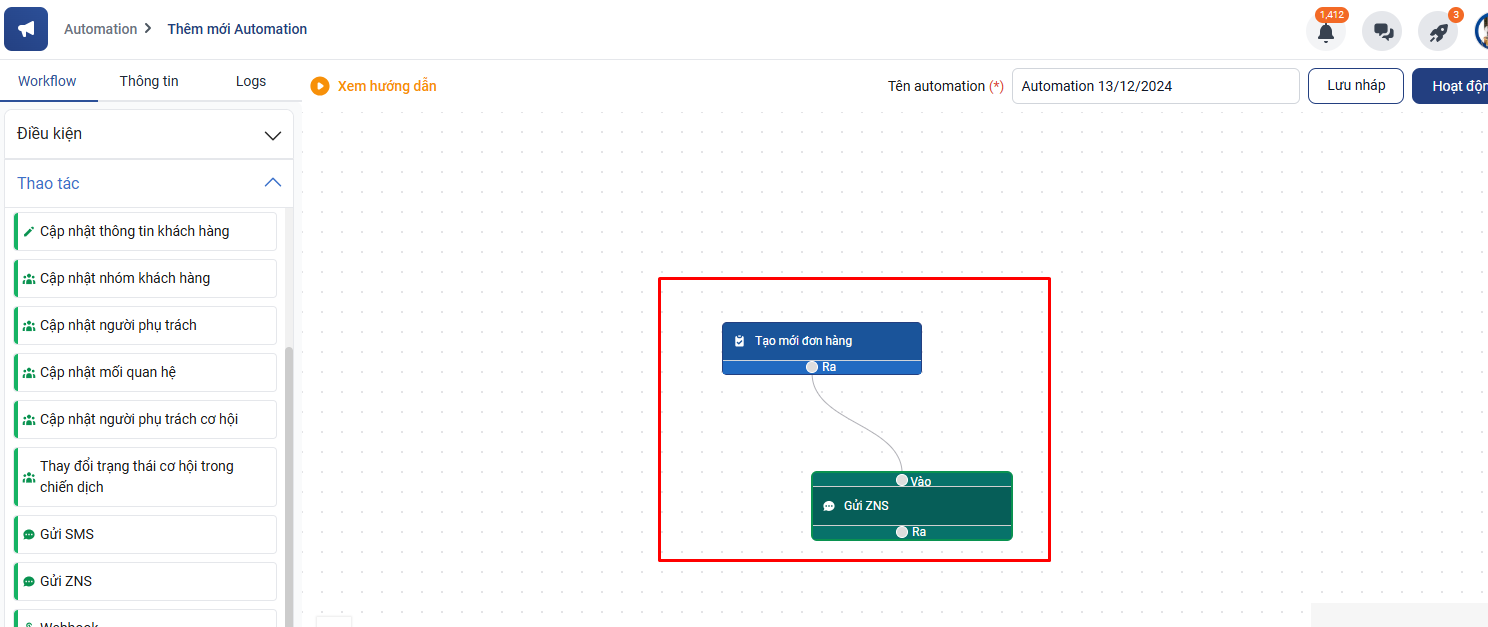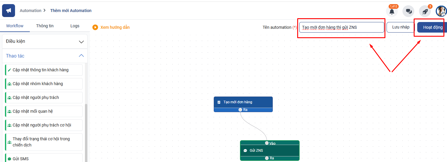 Lưu ý: Bạn cần check lại xem cấu hình tích hợp Email/ SMS/ ZNS đã gửi thành công chưa trước khi triển khai automation.
