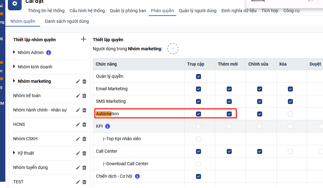 Các bạn cần được phân quyền Thêm mới Automation