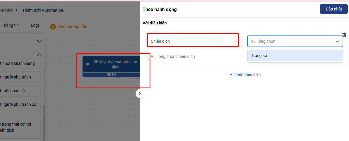 + setup điều kiện chi tiết liên quan đến các khối trên: - Hành động Khách hàng đưa vào một chiến dịch các bạn có thể chọn điều kiện trong số chiến dịch A…