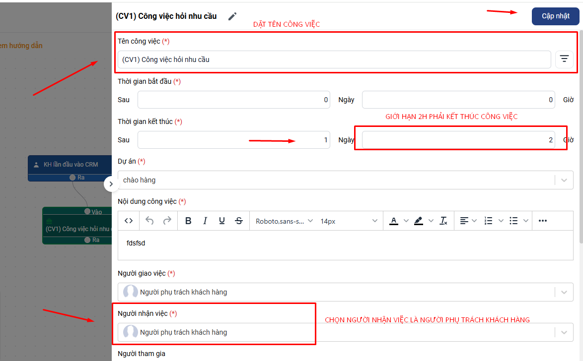 Tạo Automation khách hàng lần đầu vào CRM thì thêm mới công việc hỏi nhu cầu (CV1) Mốc 2h sẽ dùng ràng buộc thời gian kết thúc công việc.