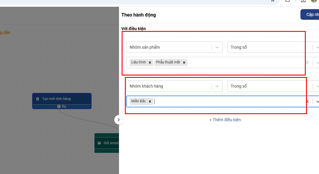 Trường hợp bạn thêm 1 điều kiện khác là nhóm khách hàng và chọn option là Miền Bắc. ➡️ Khi tạo đơn hàng, sản phẩm trong đơn hàng phải thuộc nhóm Nâng mũi hoặc Phẫu thuật mắt và khách hàng liên quan trong đơn hàng phải thuộc nhóm khách hàng Miền Bắc thì hệ quả gửi email mới được thực hiện.