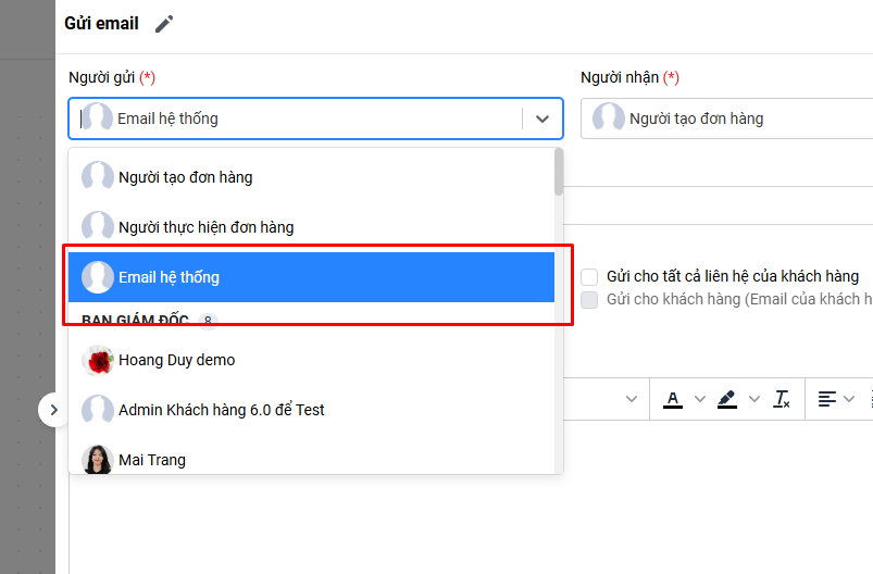 Đối với các hành động không hỗ trợ lựa chọn email hệ thống trong hệ quả gửi email, bạn có thể xử lý bằng cách tạo một user (người dùng). Trong thông tin email của user này, bạn sử dụng email đã cấu hình trong hệ thống. Khi cài đặt hành động gửi email trong Automation, bạn chọn user này làm người gửi.
