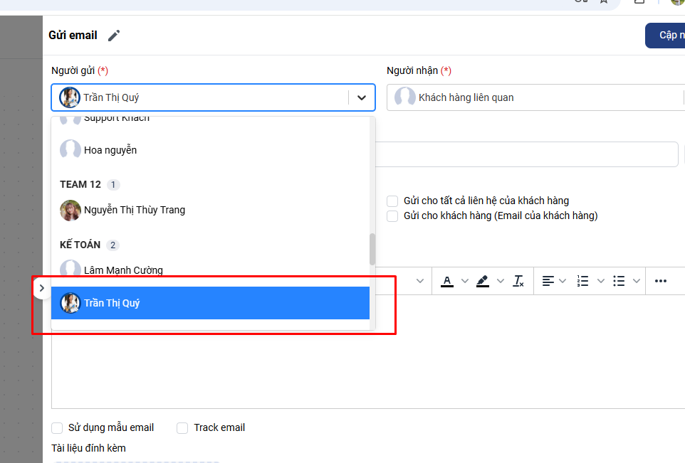 Thao tác: Gửi email cho khách hàng liên quan