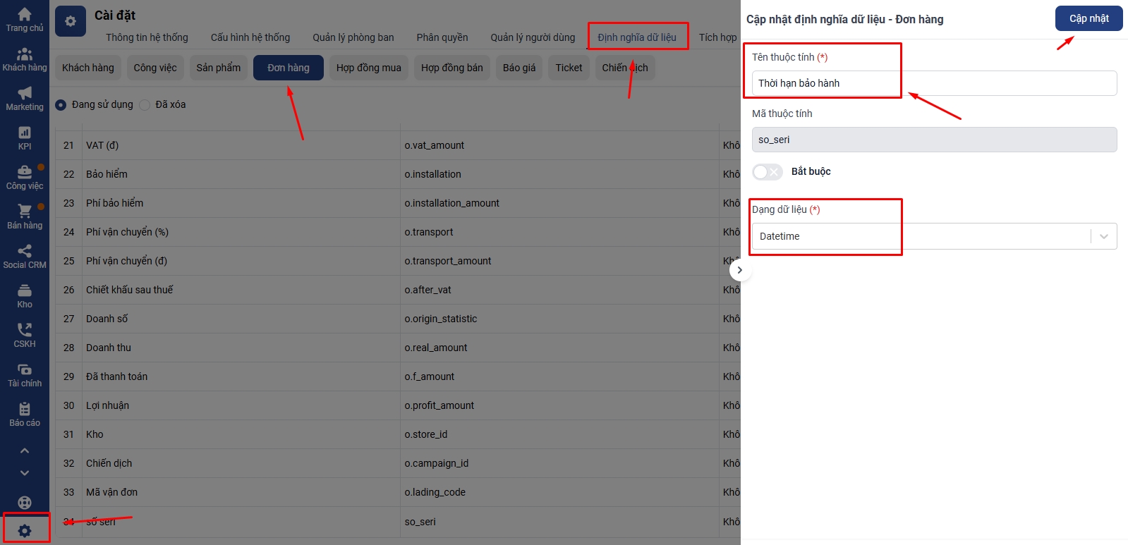 Bước 1: Tạo 1 trường định nghĩa dữ liệu “Thời hạn bảo hành” trong đơn hàng