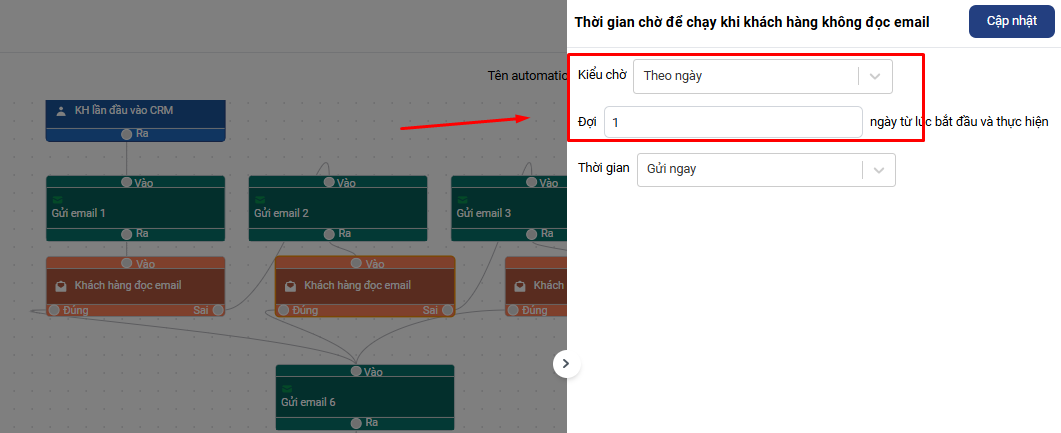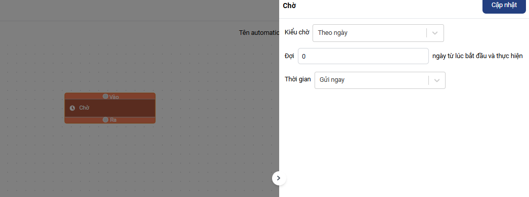 Chờ sau khi phát sinh điều kiện thỏa mãn: Khi một điều kiện được thỏa mãn trong quy trình tự động hóa (automation), hệ thống sẽ chờ một khoảng thời gian nhất định trước khi tiếp tục thực hiện các hành động tiếp theo. Ví dụ, bạn có thể đặt "Chờ 1 giờ" sau khi một email được gửi đi, trước khi tiếp tục gửi email tiếp theo hoặc thực hiện một tác vụ khác.