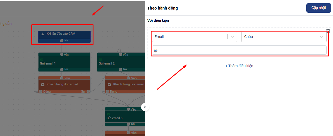 Hành động: Khách hàng lần đầu vào CRM (Điều kiện: Email chứa @)