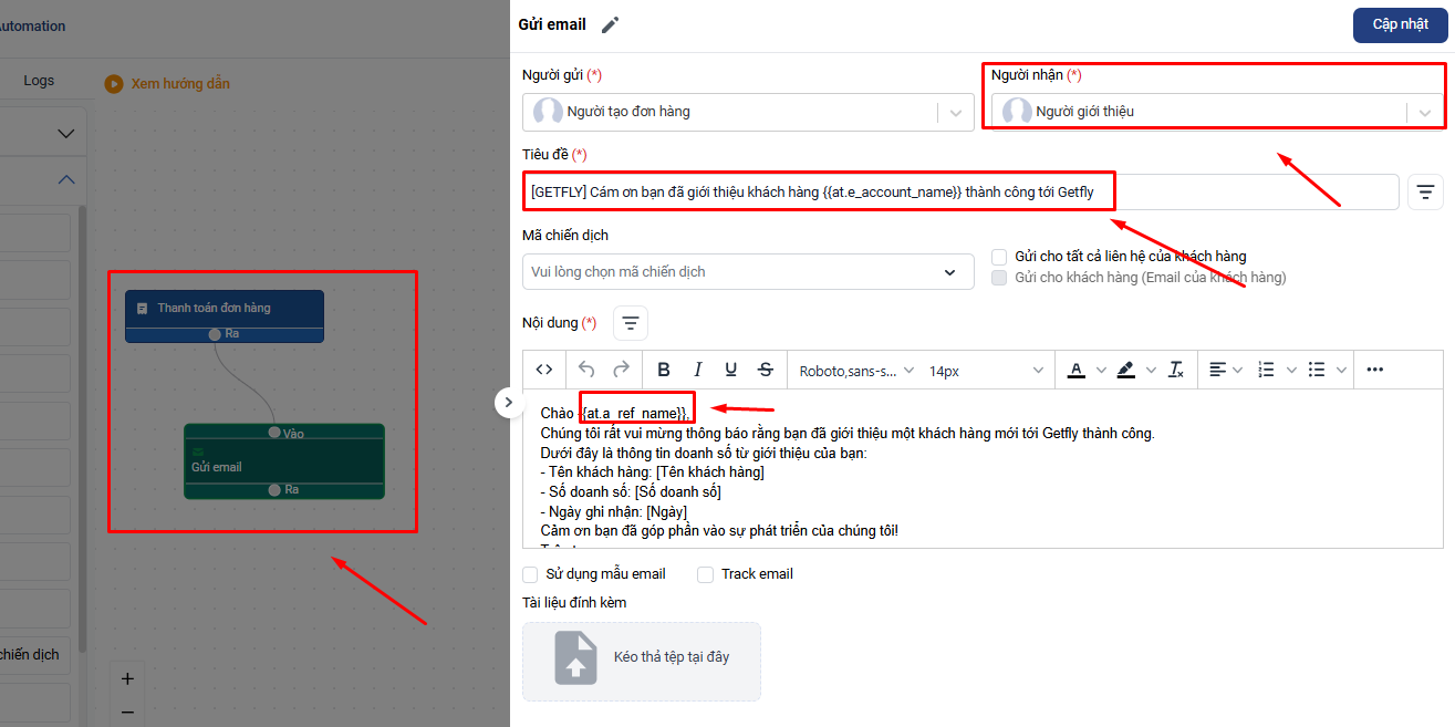 Nếu bạn muốn gửi thông tin về doanh thu mới phát sinh của khách hàng được giới thiệu cho người giới thiệu nhằm thông báo, cảm ơn hay tri ân, bạn có thể tham khảo cách thiết lập automation sau: