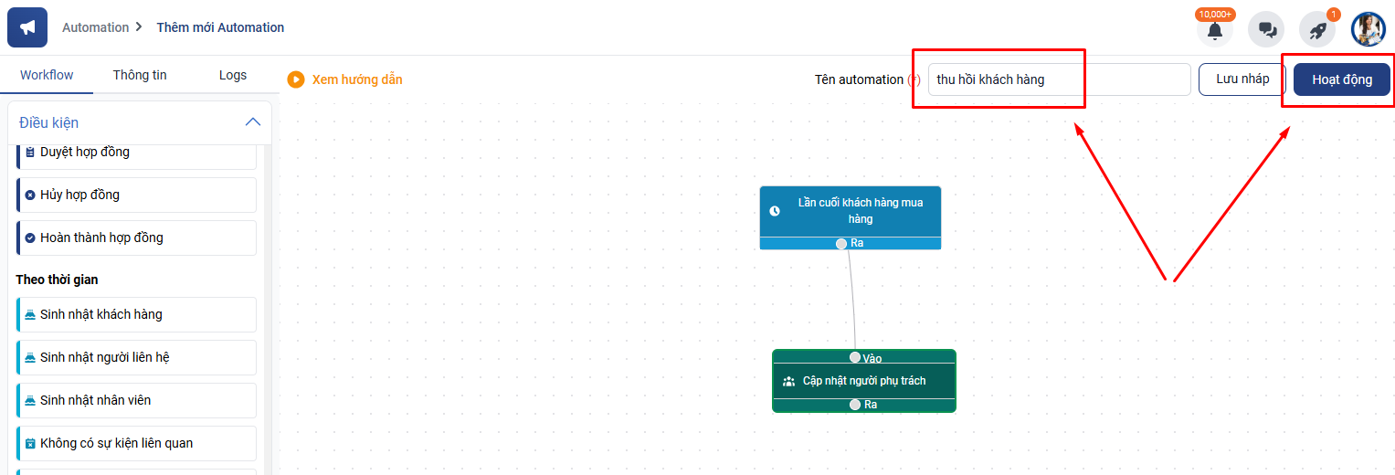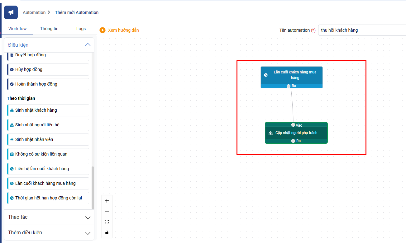 - Mô tả automation: thu hồi người phụ trách khách hàng những khách hàng có lần cuối mua hàng trong trong khoảng thời gian nhất định.