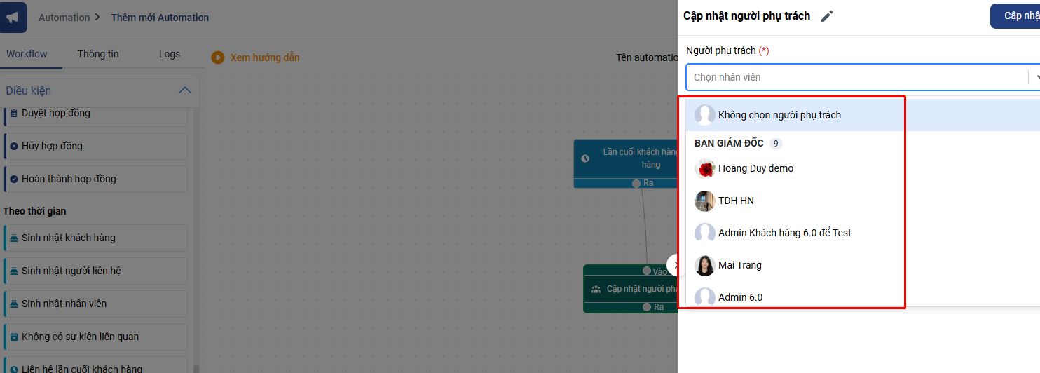 + Phần hệ quả cập nhật người phụ trách khách hàng: Bạn chọn nhân viên phụ trách khách hàng mới hoặc chọn Không chọn người phụ trách khách hàng ( lúc này khách hàng sẽ về trạng thái không có ai phụ trách)