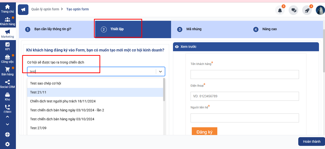 Các bạn tạo mới 1 Optinform và đẩy vào chiến dịch đã tạo ở Bước 1 để quản lý