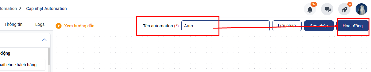 + Đặt tên Automation và ấn Hoạt động để kích hoạt auto