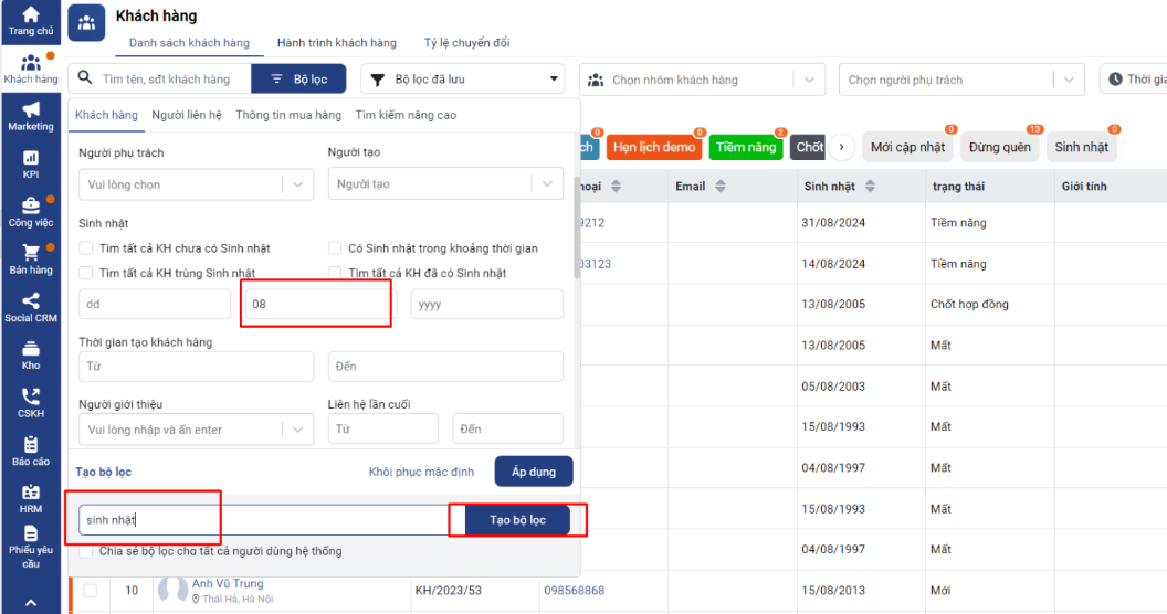 Bước 1: Bạn vào mục khách hàng tạo bộ lọc khách hàng sinh nhật trong tháng: