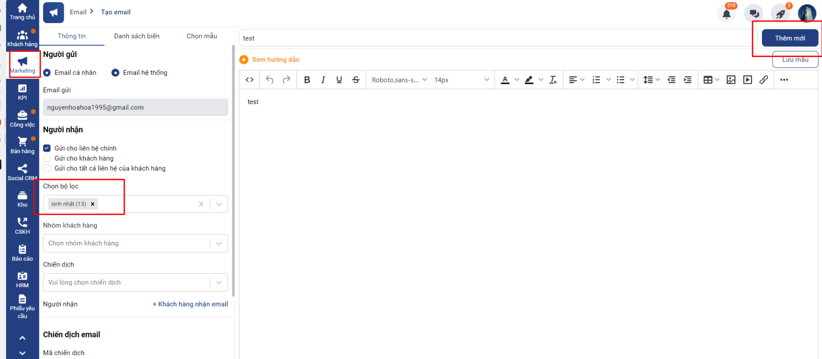 Bước 2: Bạn vào mục email marketing để gửi mail cho bộ lọc này
