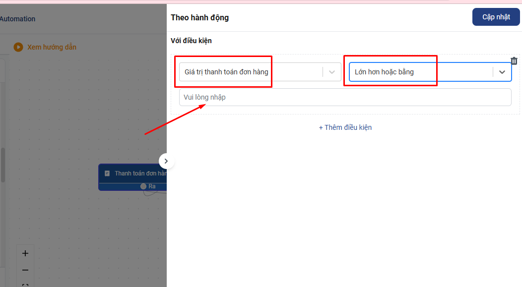 Bước 4. Trong điều kiện Thanh toán đơn hàng bạn chọn giá trị đơn thanh toán của đơn hàng, chọn điều kiện đi kèm lớn hơn hoặc bằng và nhập giá trị đơn hàng