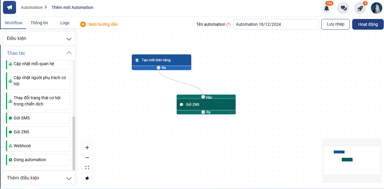 Để tạo automation khi có đơn hàng mới thì gửi ZNS tới khách hàng, bạn thao tác như sau: