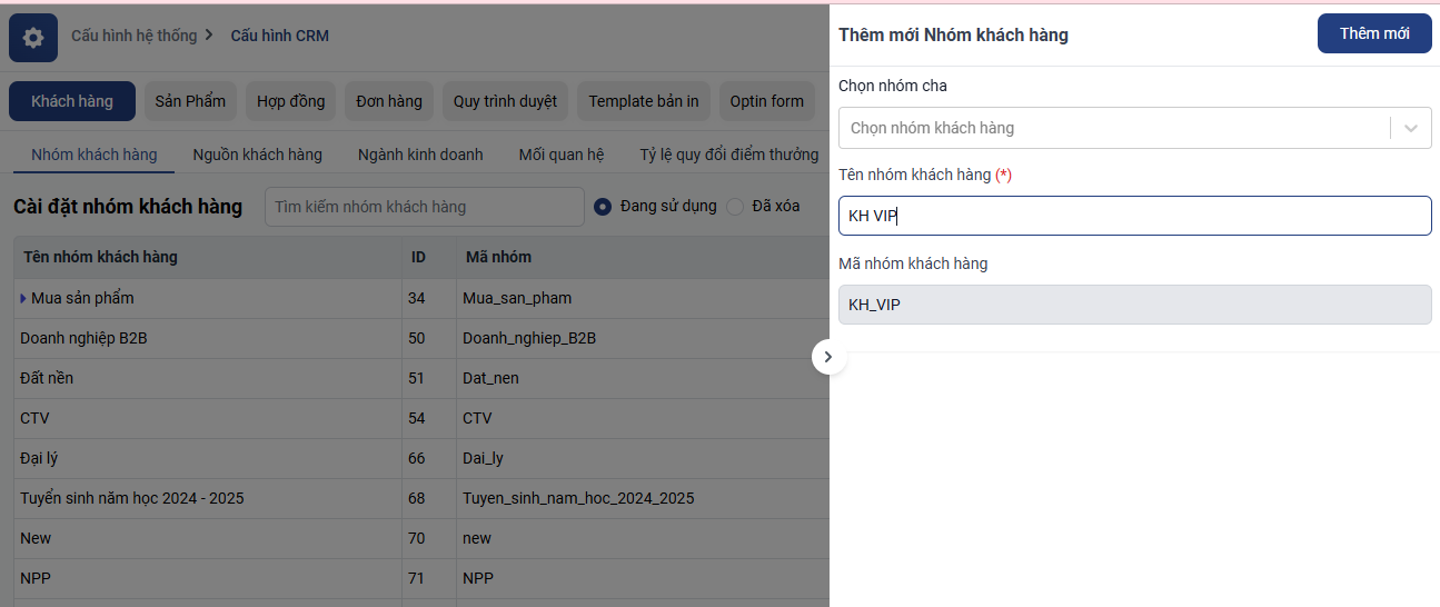 Để tạo mới nhóm nhóm khách hàng bạn truy cập Cài đặt ⇒ Cấu hình hệ thống ⇒ Cấu hình CRM ⇒ Khách hàng ⇒ Nhóm khách hàng ⇒ Thêm mới, nhập tên nhóm khách hàng và nhấn thêm mới