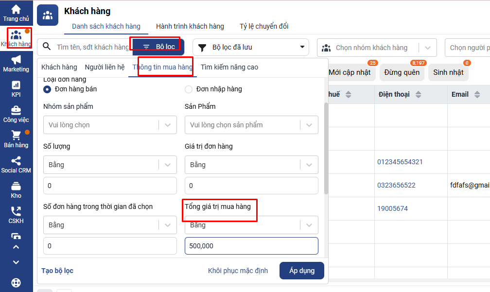 Bạn truy cập vào màn hình danh sách khách hàng ⇒ Bộ lọc ⇒ Thông tin mua hàng ⇒ Trạng thái mua hàng chọn đã mua ⇒ thời gian mua hàng chọn thời cụ thể ⇒ Tổng giá trị mua hàng lựa chọn giá trị mong muốn (ví dụ: tổng giá trị mua hàng bằng 500.000.000)