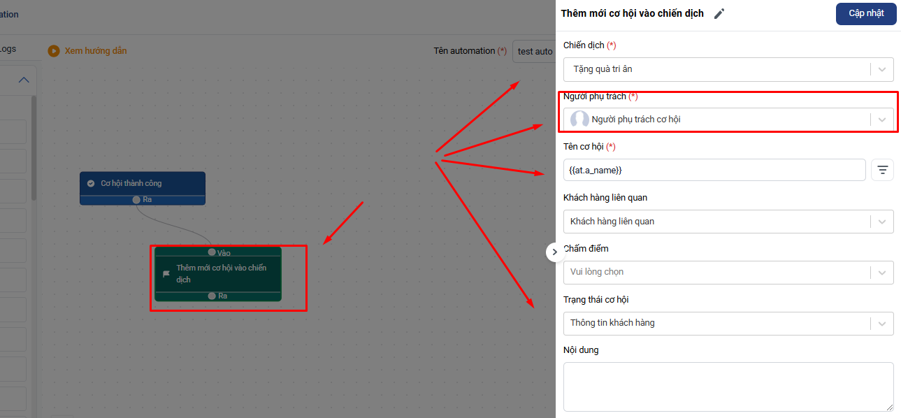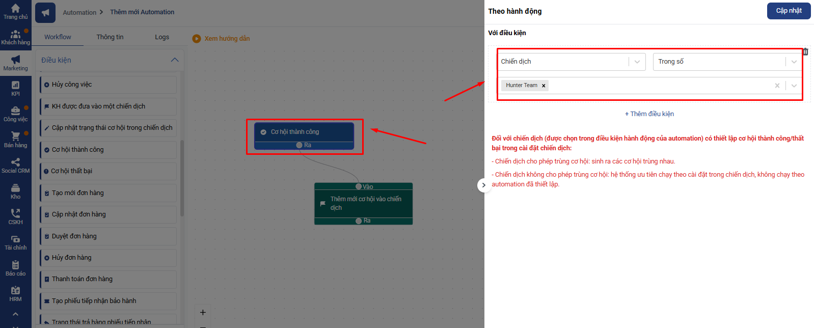 Điều kiện: Các điều kiện liên quan đến cơ hội và chiến dịch (VD: Cơ hội thành công / Cơ hội thất bại / Cập nhật trạng thái cơ hội trong chiến dịch/ KH được đưa vào một chiến dịch)