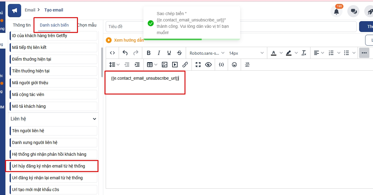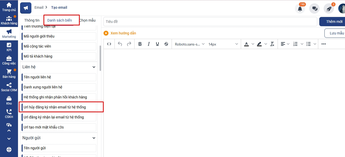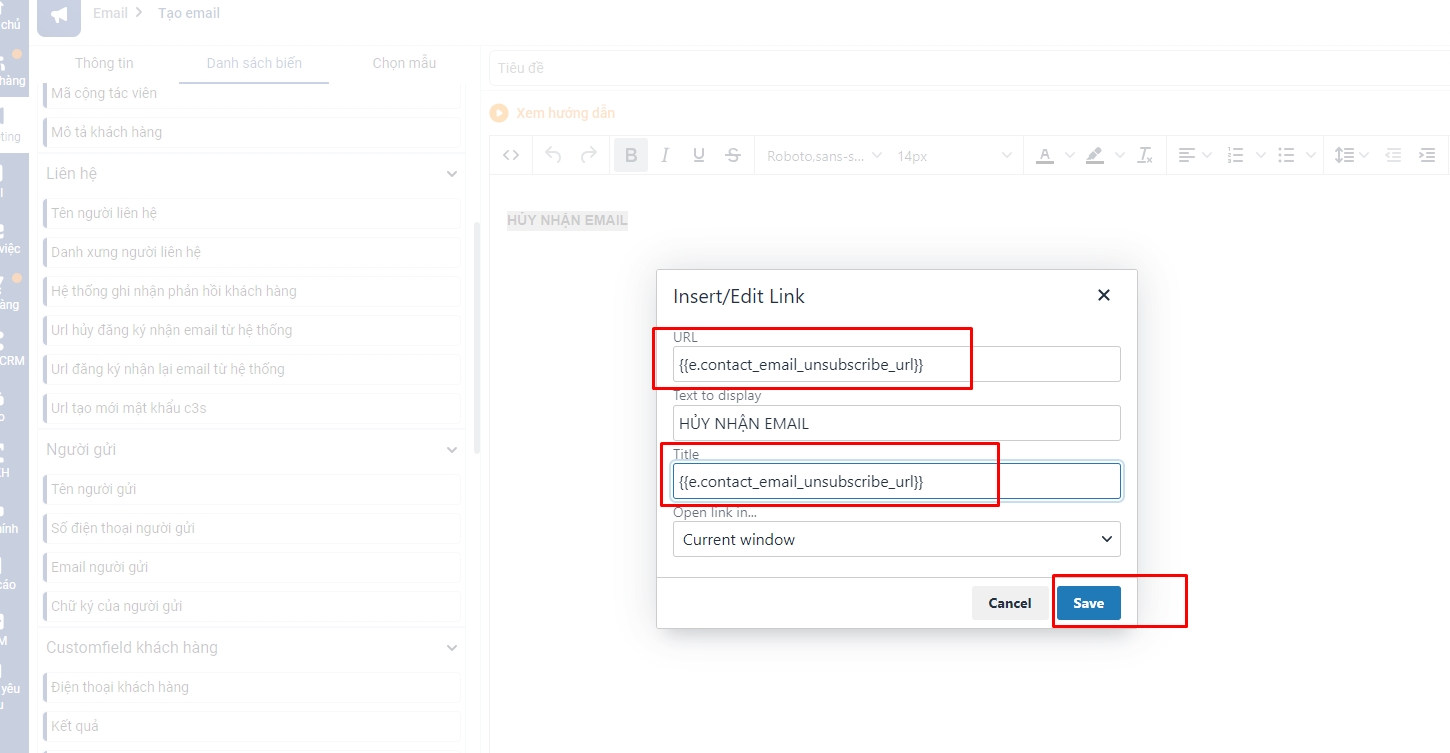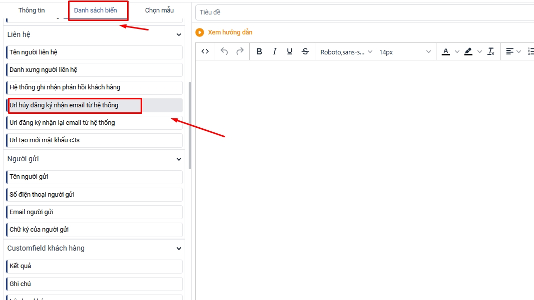 Để tạo nút hủy đăng ký nhận email từ hệ thống bạn thao tác theo hướng dẫn sau: Bước 1: Bạn vào màn hình thêm mới Email => chọn mục danh sách biến => Copy biến url hủy đăng kí nhận email từ hệ thống