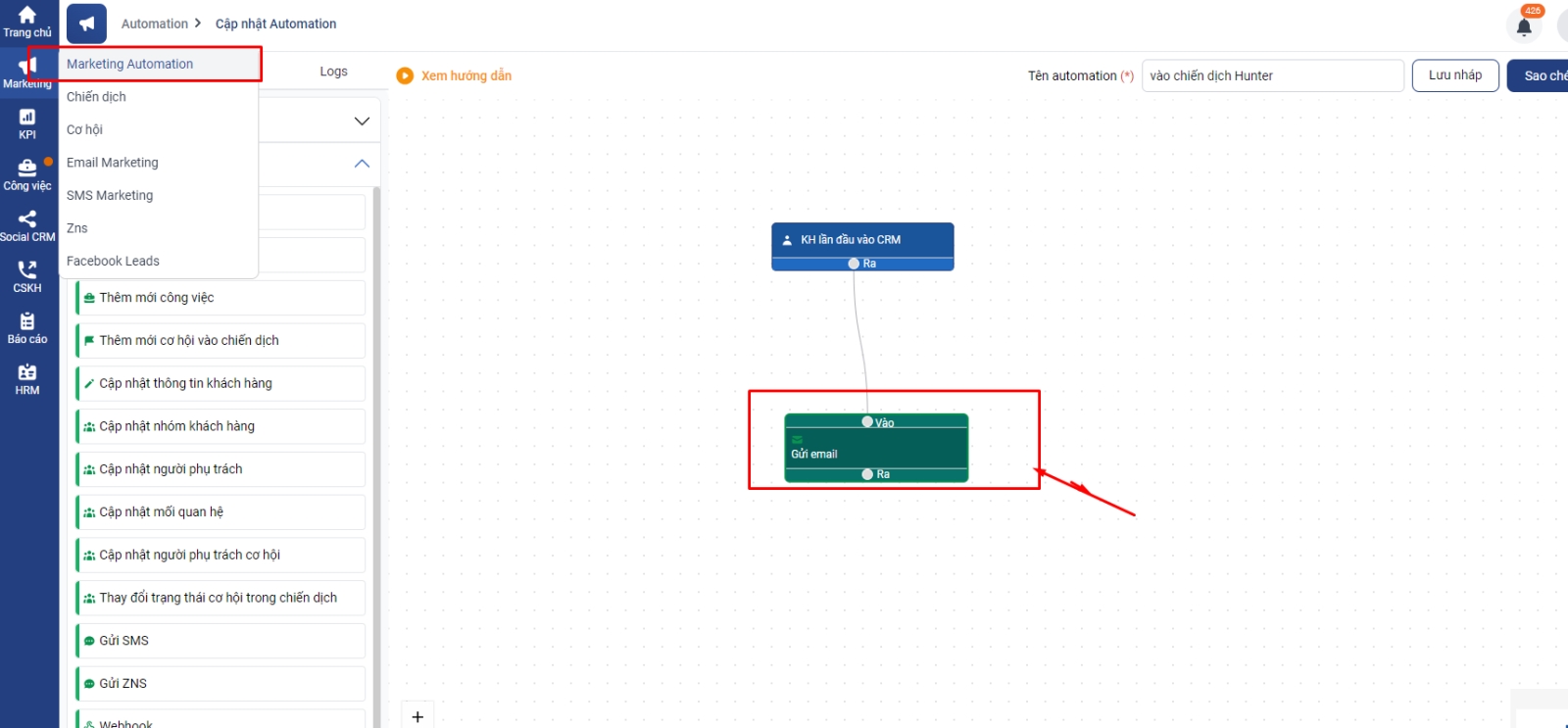 + Chọn điều kiện Khách hàng lần đầu vào CRM và Thao tác Gửi Email
