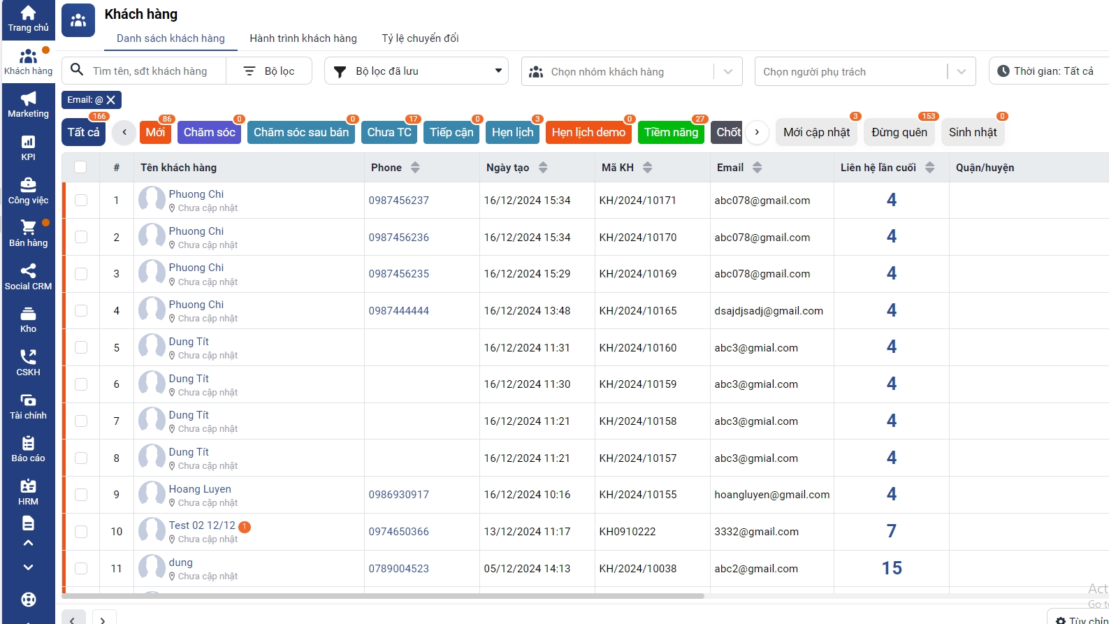 - Hệ thống sẽ hiển thị tất cả khách hàng có email mà bạn có quyền xem khách hàng: