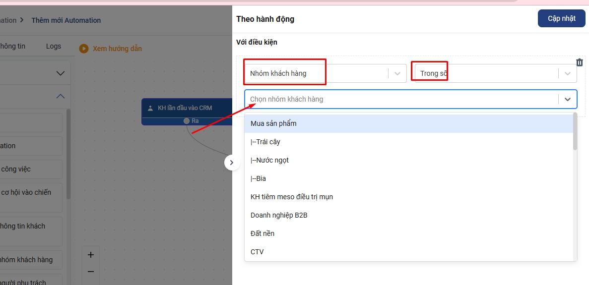 + Trong điều kiện Khách hàng lần đầu vào CRM, các bạn chọn điều kiện nhóm khách hàng tương ứng