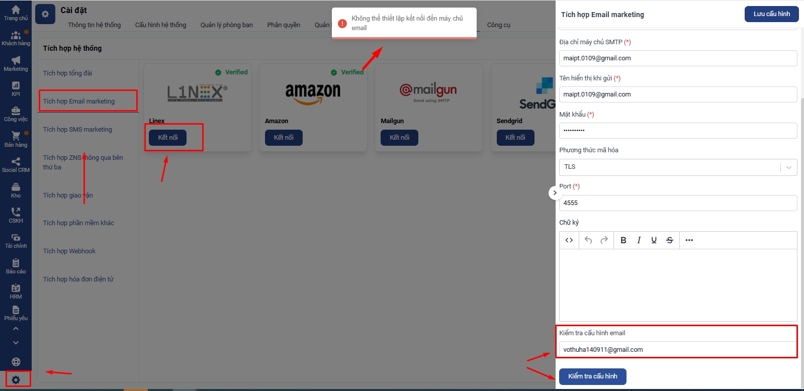 1. Cấu hình tích hợp email bị sai