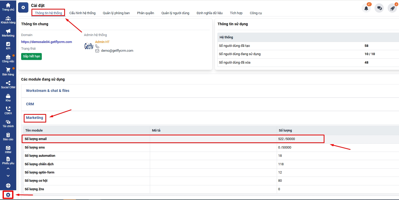 Cài đặt → Thông tin hệ thống → Marketing → Số lượng Email