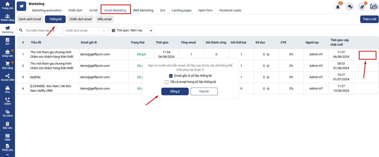 Ngoài ra thường xuyên loại bỏ các địa chỉ email không còn hoạt động hoặc không muốn nhận email trên hệ thống Getfly