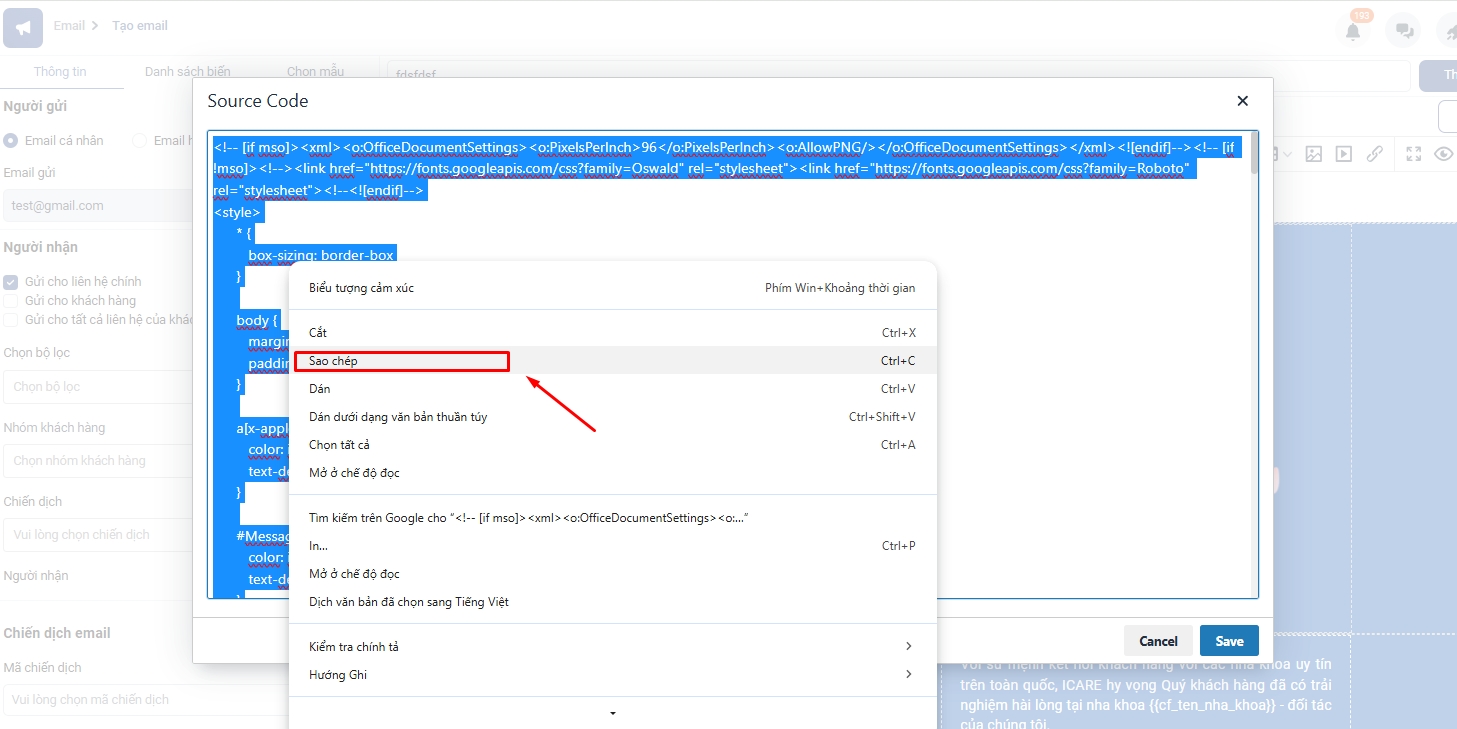 Tại màn hình Email → Click biểu tượng < > Source code