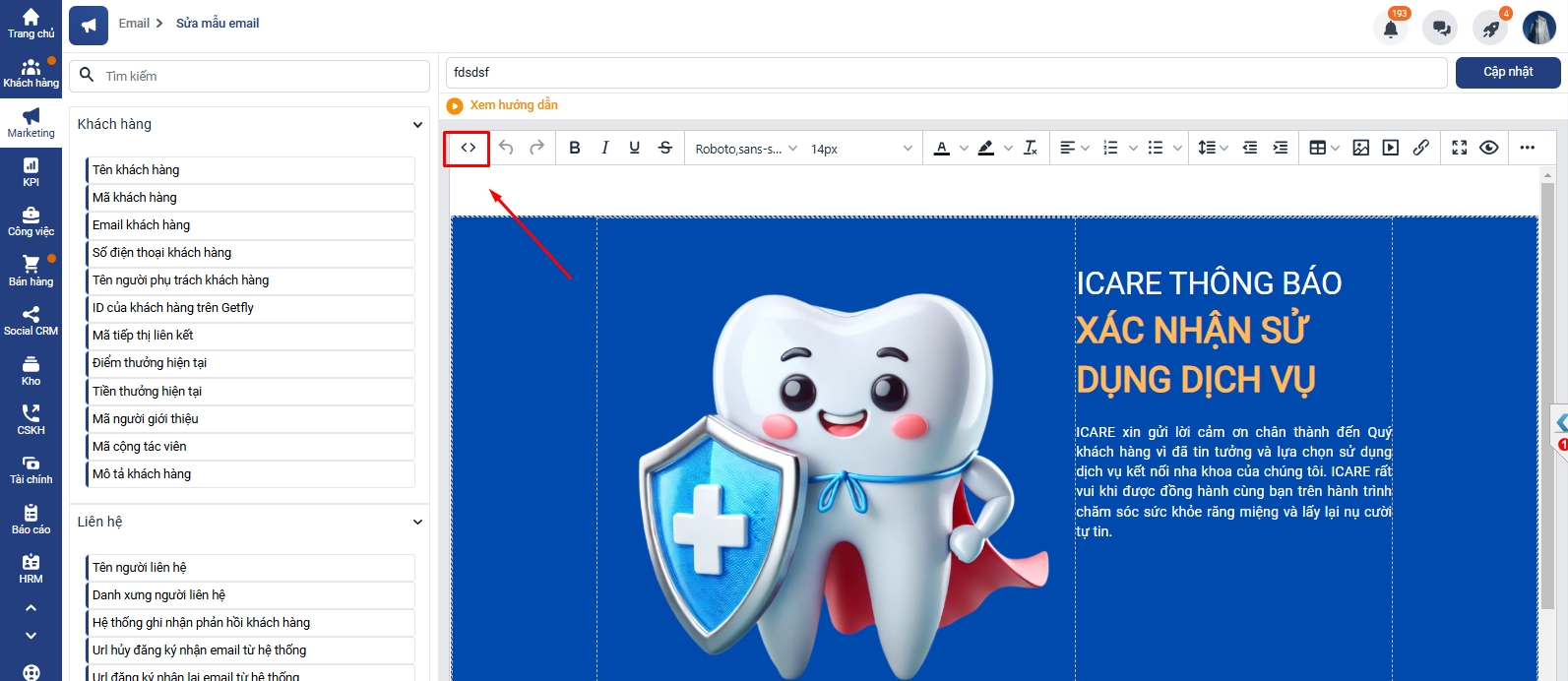 Lưu ý: file HTML bạn tải lên có thể sẽ không đồng nhất về code với Getfly nên sẽ dẫn đến tình trạng xung đột về code và sai format của email. Bạn có thể chỉnh sửa lại mẫu này trực tiếp trên Getfly theo hướng dẫn