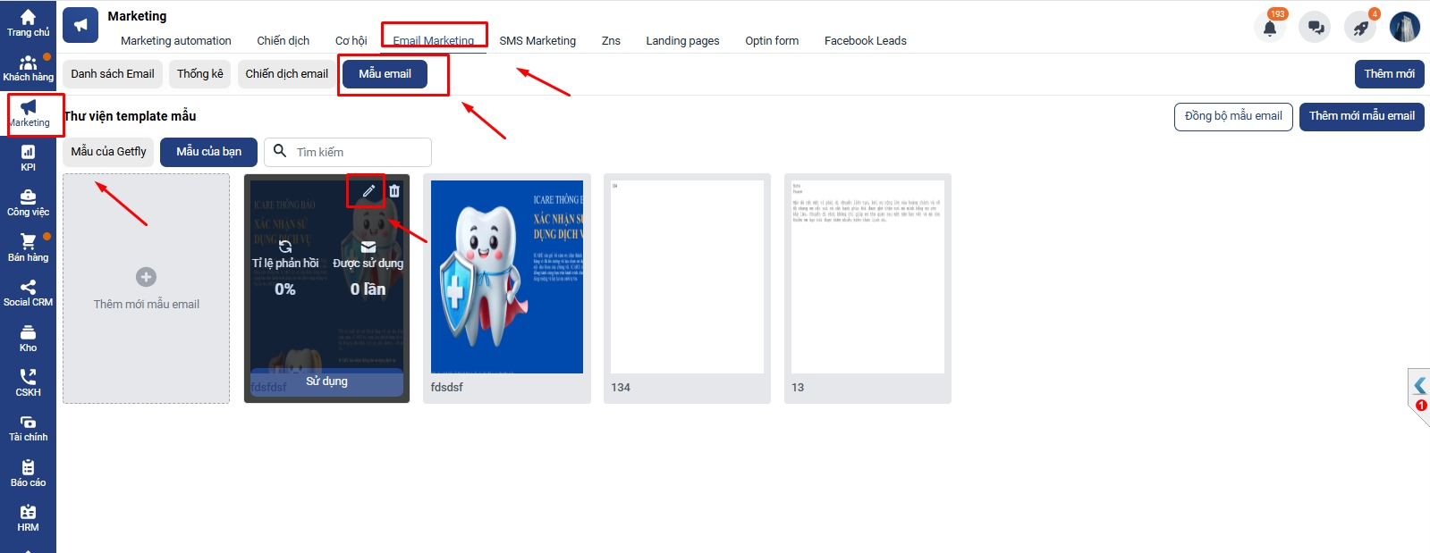 Chọn Marketing → Email marketing → Mẫu email → Chọn sửa mẫu email mình muốn lưu trữ