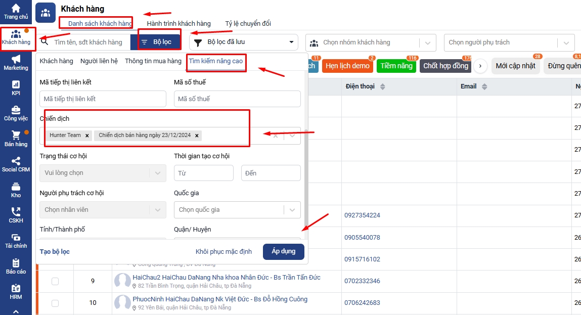 Khách hàng → Danh sách khách hàng → Bộ lọc → Tìm kiếm nâng cao
