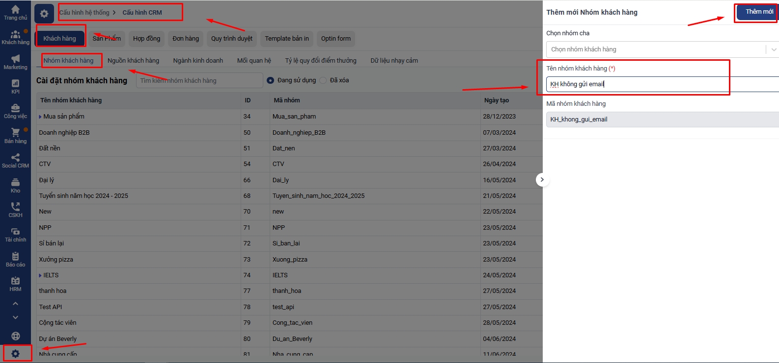 Cài đặt → Cấu hình hệ thống → Cấu hình CRM → Khách hàng → Nhóm khách hàng→ Thêm mới → Đặt tên nhóm → Thêm mới