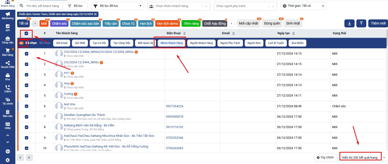 Để hiện thị khoảng 200 kq/ trang → Tích chọn cả trang → Nhóm khách hàng