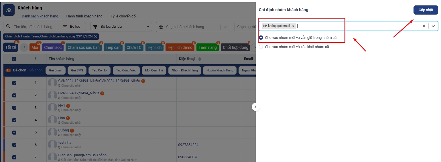 Bước 2. Lọc các khách hàng ở 2 chiến dịch này và đưa vào nhóm khách hàng “KH không gửi email” vừa tạo