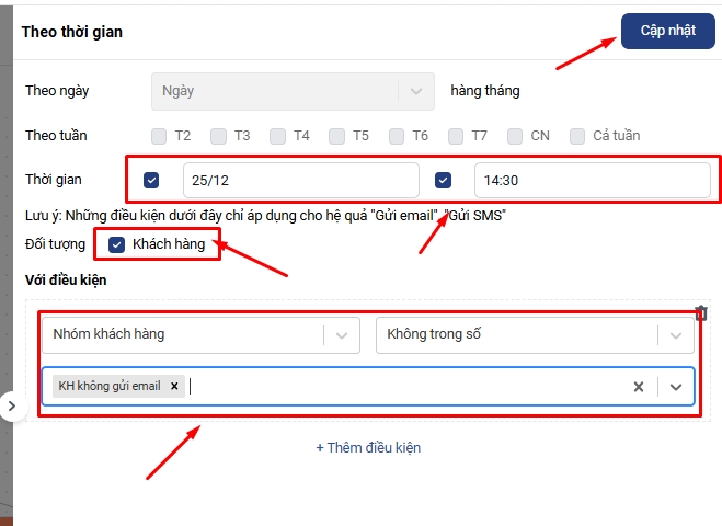 Điều kiện: Không có sự kiện liên quan (Chọn thời gian cố định muốn gửi email; Đối tượng: Khách hàng; Nhóm khách hàng Không trong số "“KH không gửi email”)