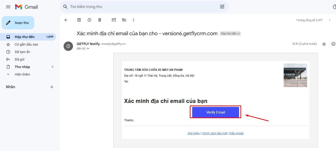 Bạn hãy click vào biểu tượng ! để Getfly gửi email Vertify về hòm mail của bạn → Sau đó vào hòm mail cá nhân: vertify email