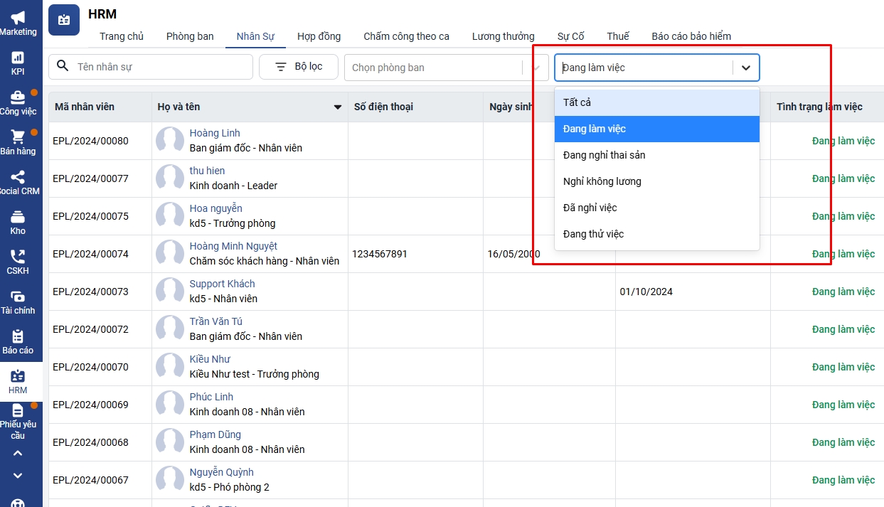 2. Thao tác tìm kiếm nhân sự theo tình trang làm việc