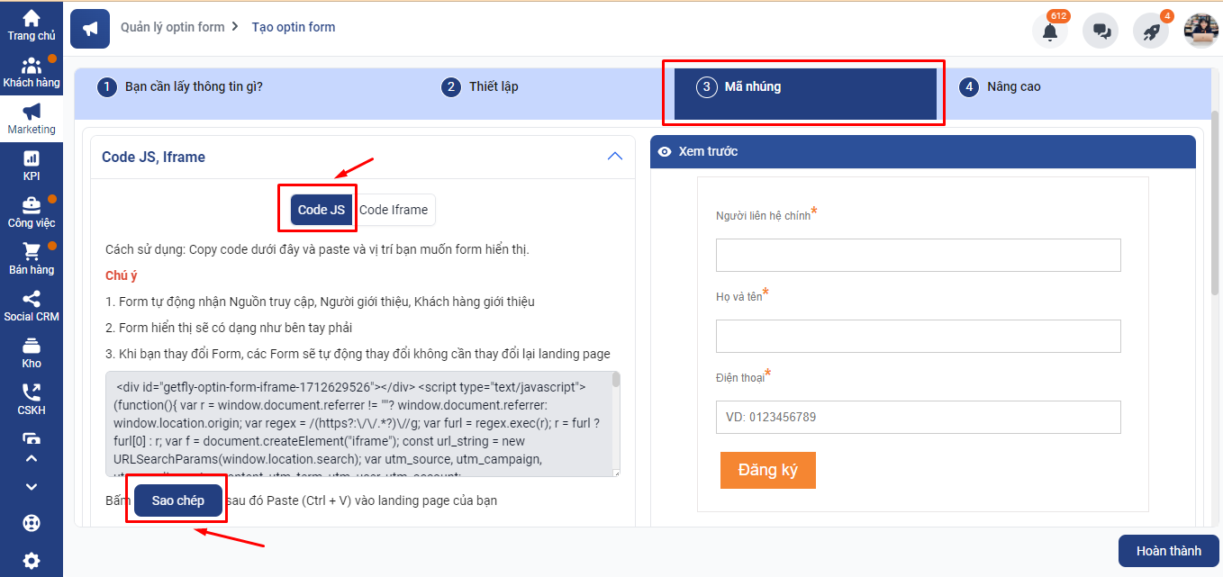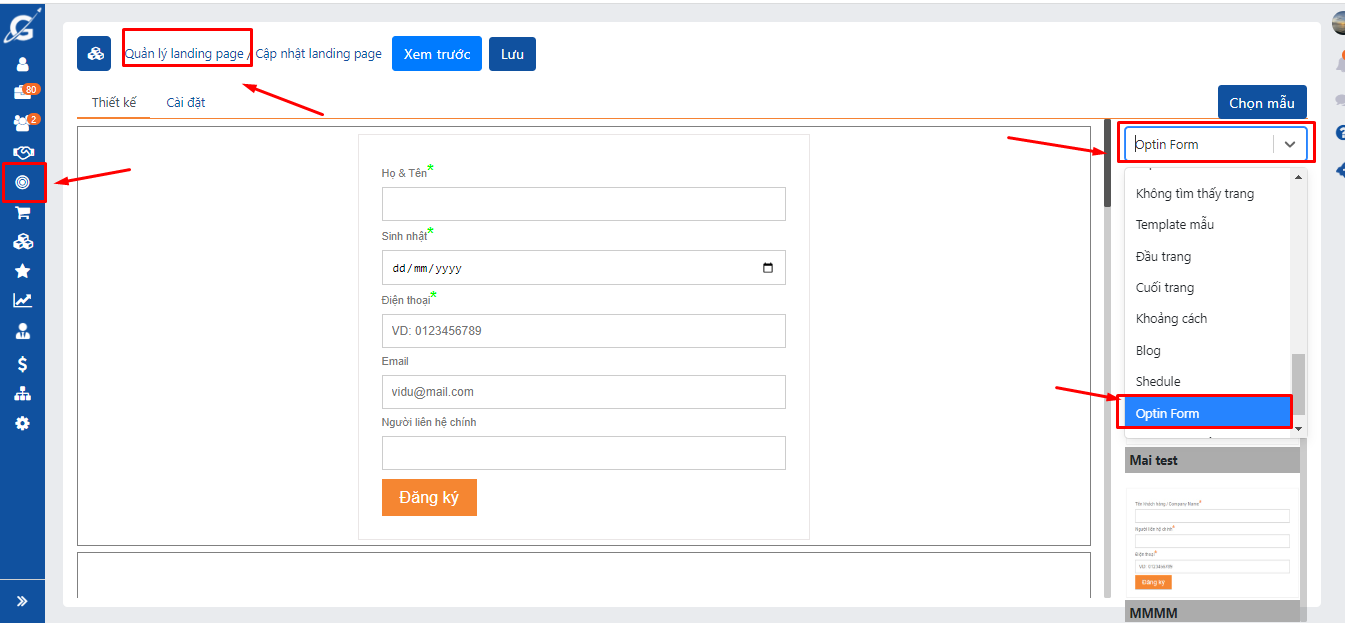 Câu 3. Làm thế nào để chèn Optinform vào Ladipage trên Getfly?