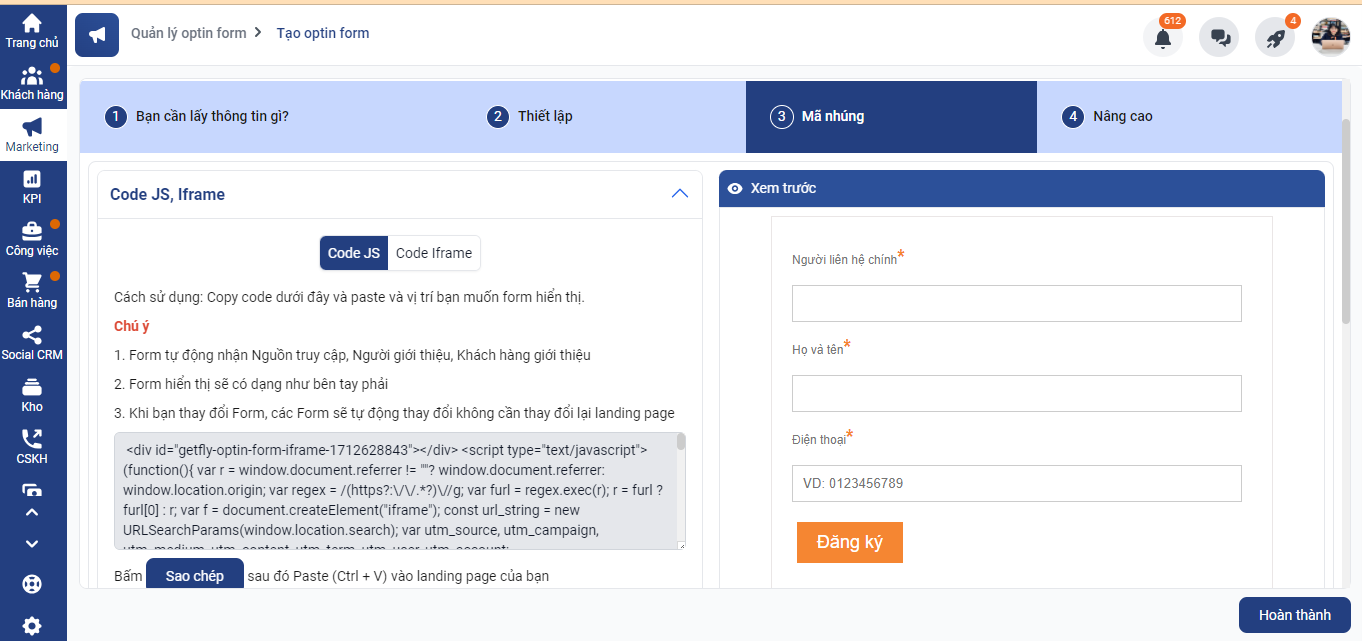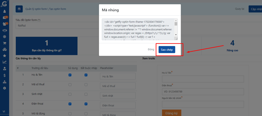 Bước 1. Tạo form trên Getfly