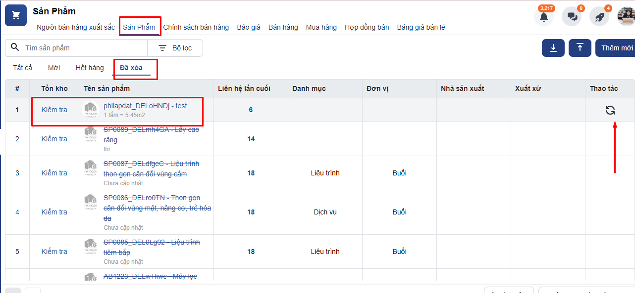 Sản phẩm đã xóa sẽ hiển thị ở tab Đã xóa trong màn hình danh sách sản phẩm, bạn có thể phục hồi lại sản phẩm đó nếu muốn