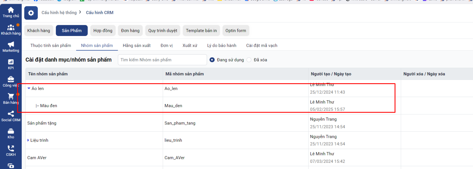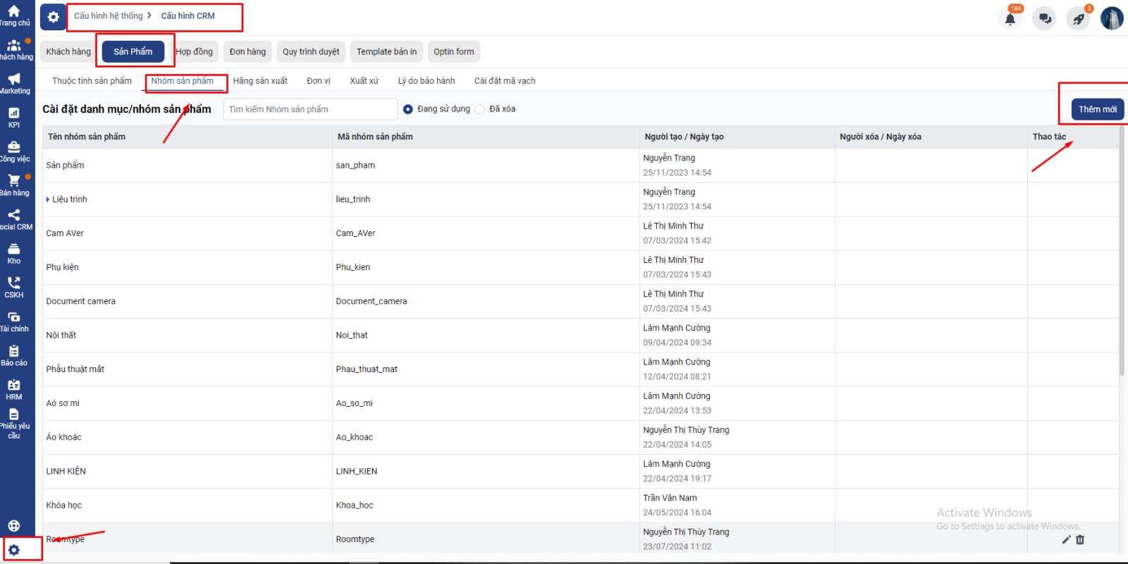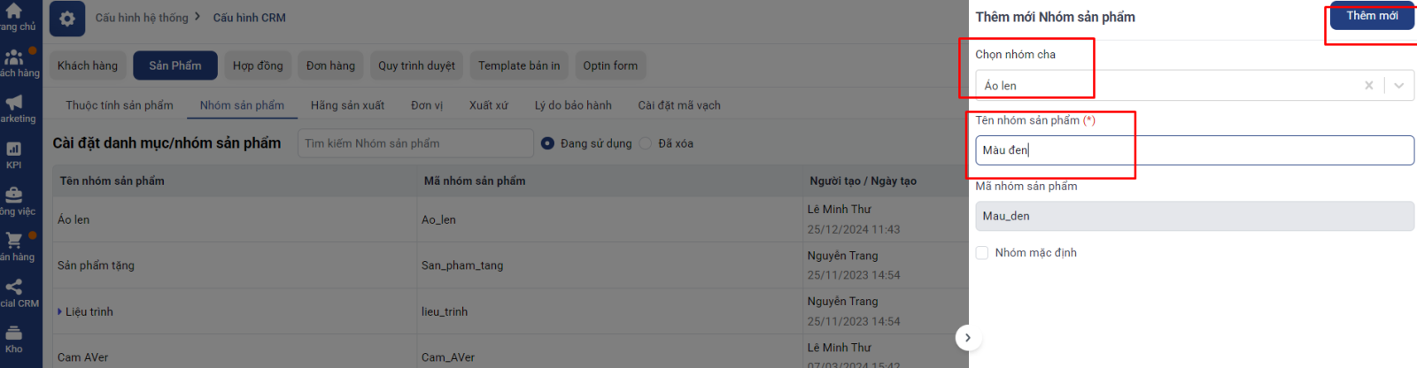 - Bạn vào mục cài đặt -> chọn cấu hình CRM -> sản phẩm -> chọn nhóm sản phẩm -> ấn thêm mới nhóm sản phẩm