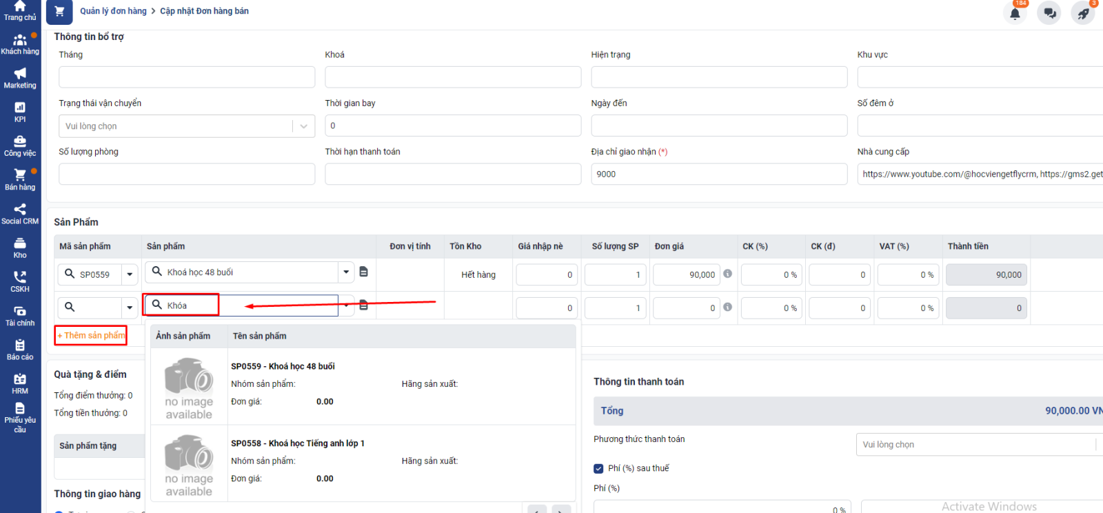 Ví dụ: Với sản phẩm Khóa học Tiếng anh lớp 1 khi thêm 1 dòng ( thêm hạng mục) sẽ bao gồm: