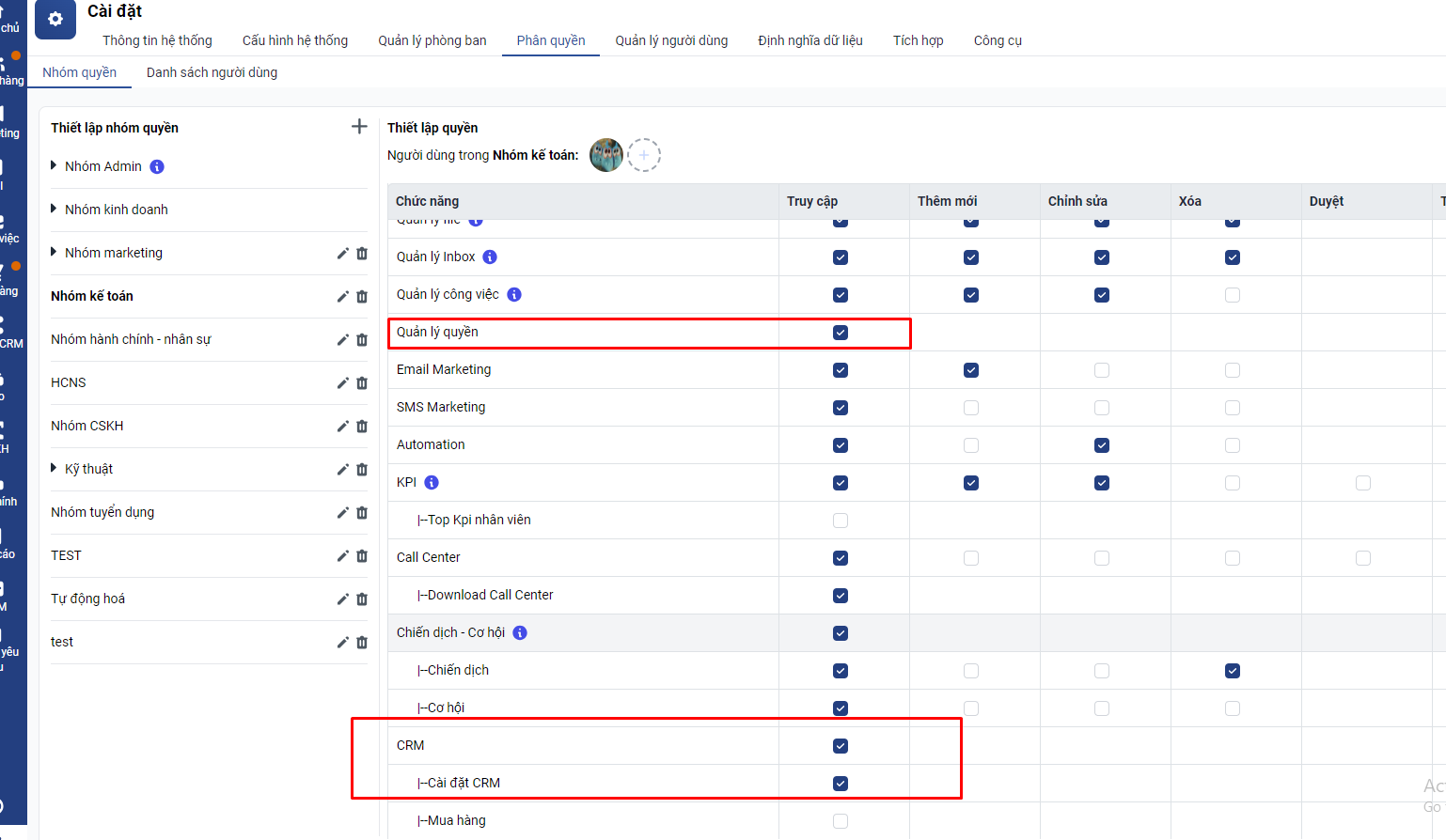 - Để tạo danh mục sản phẩm trên hệ thống bạn cần có quyền cài đặt CRM và quản lý quyền trên hệ thống