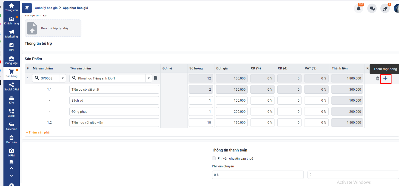 - Khi thêm dấu cộng “ thêm một dòng sản phẩm ” nghĩa là thêm hạng mục tương ứng với từng dòng sản phẩm. Để giải thích chi tiết và liệt kê cụ thể hơn các sản phẩm trong báo giá sẽ bao gồm hạng mục nào với đơn giá, số lượng chi tiết.