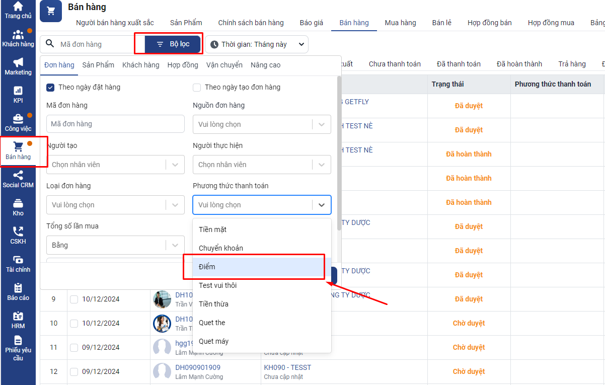 Hiện tại hệ thống chưa tổng hợp được phiếu thu từ điểm thưởng. Tuy nhiên hệ thống đã lọc được đơn hàng theo hình thức thanh toán điểm thưởng: